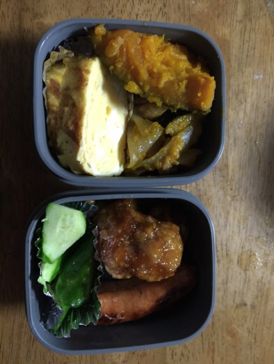 6時半に家を出る夫のために、バタバタで弁当作り。 メニューは、かぼちゃの煮物、鶏唐揚げ、卵焼き、ウインナー、きゅうり。
