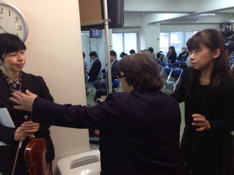 特別賛美が始まるタイミングで、オーケストラメンバーの祈りに入ります。その前に、ちゃんと楽器を出します。周りのメンバーの動きを見てハッと気づく事も。