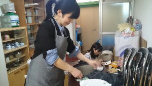 恵さんがホットプレートの油を拭き取ってます。Akari,