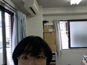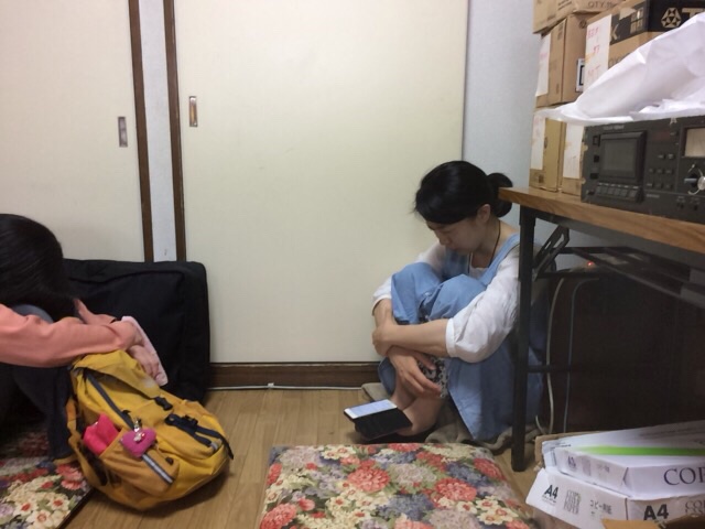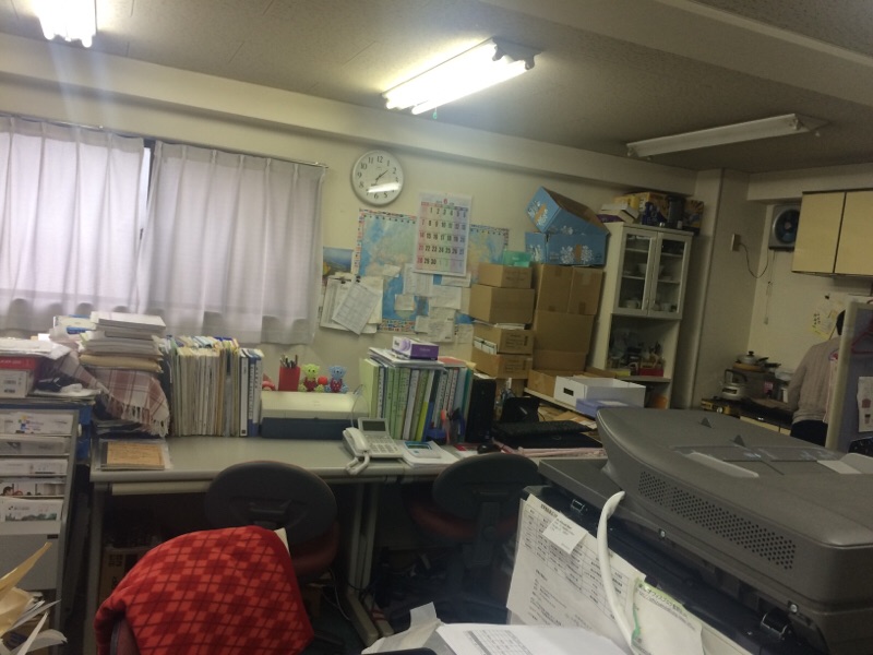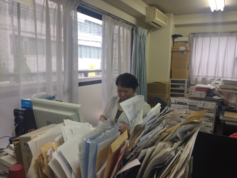 今日はまだ静かな事務局。蒸し暑いので窓全開です。