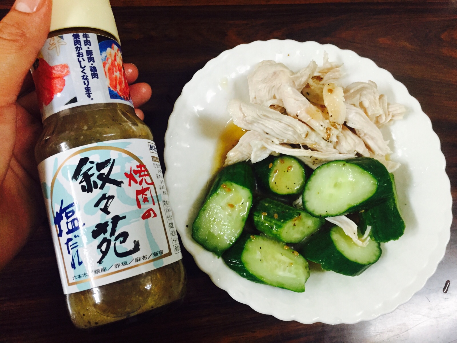今日は鶏モモ肉が100g 58円で激安だったのでそれをさっとゆがいて叙々苑の塩ダレをかけます。
