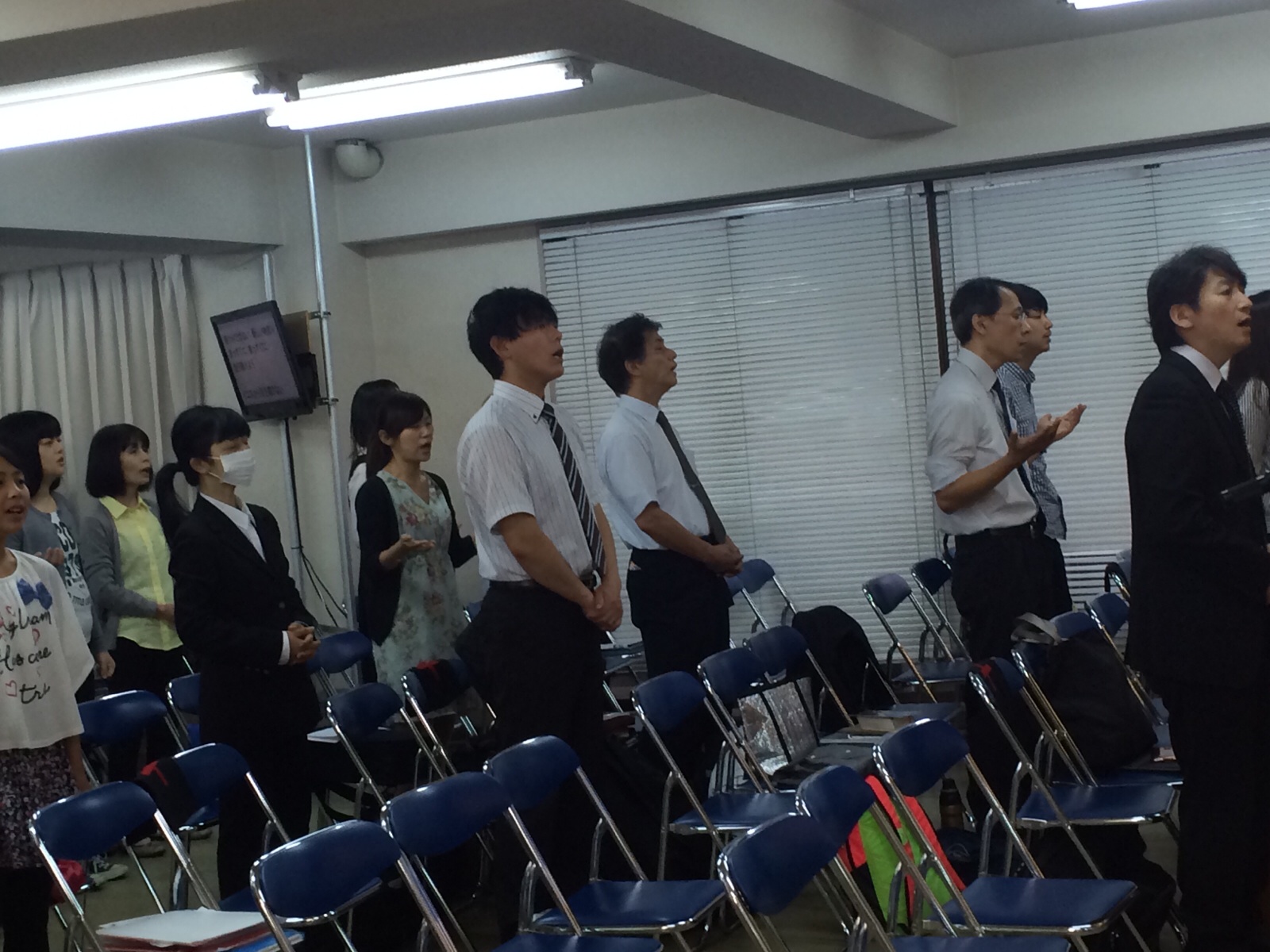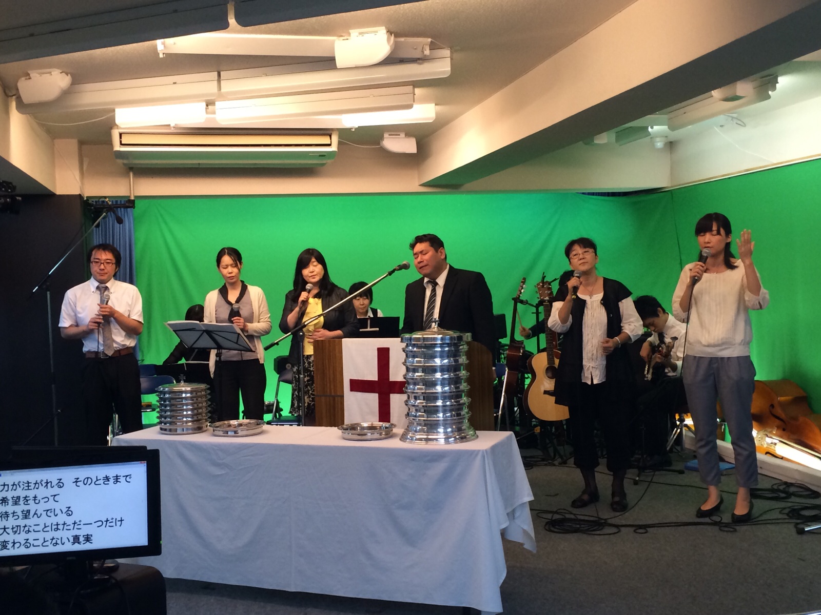 聖餐式の時。 森さんが導きます。新しい方も来られています。