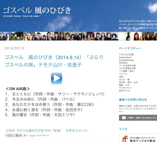 昨日、私たちの番組がオンエアでした。応募曲を5曲紹介しています。 ぶらりゴスペルの旅 テモテ
