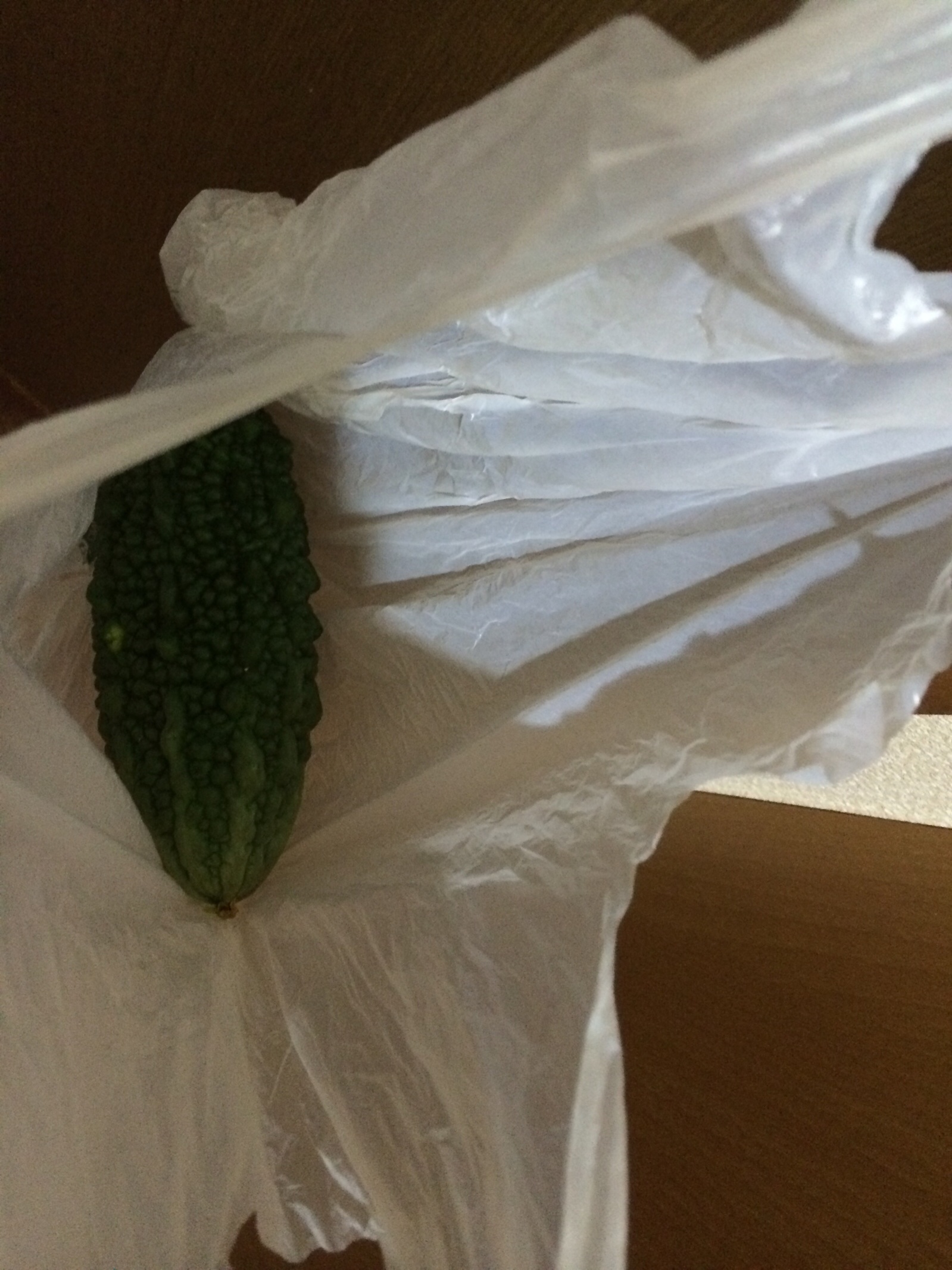 家に帰ったら、部屋のドアノブにゴーヤが!K牧師かな? すごく嬉しいです。 「ゴスペルのご馳走、いただきま〜す」横尾