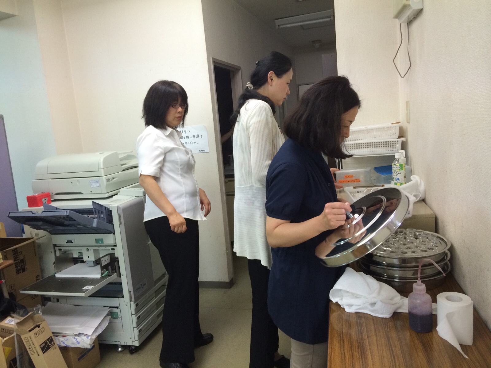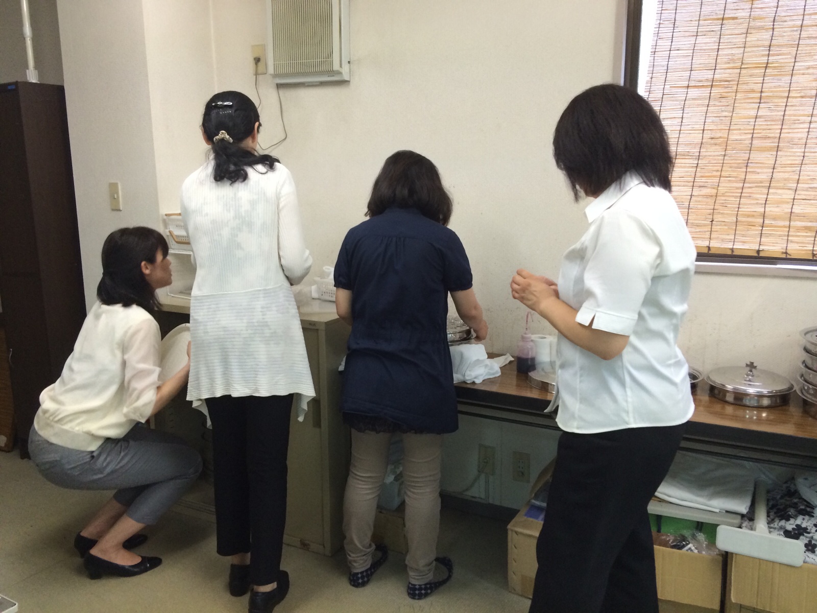 忙しく聖餐の片付けと第7礼拝の聖餐の準備をしている皆さん。 『いただきま〜す 横尾』