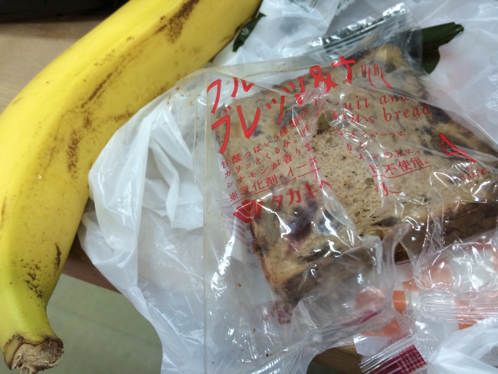 お昼です。大野さんにいただいたバナナと香代ちゃんにいただいたパン。 神さま、感謝致します! 『いただきま〜す 横尾』