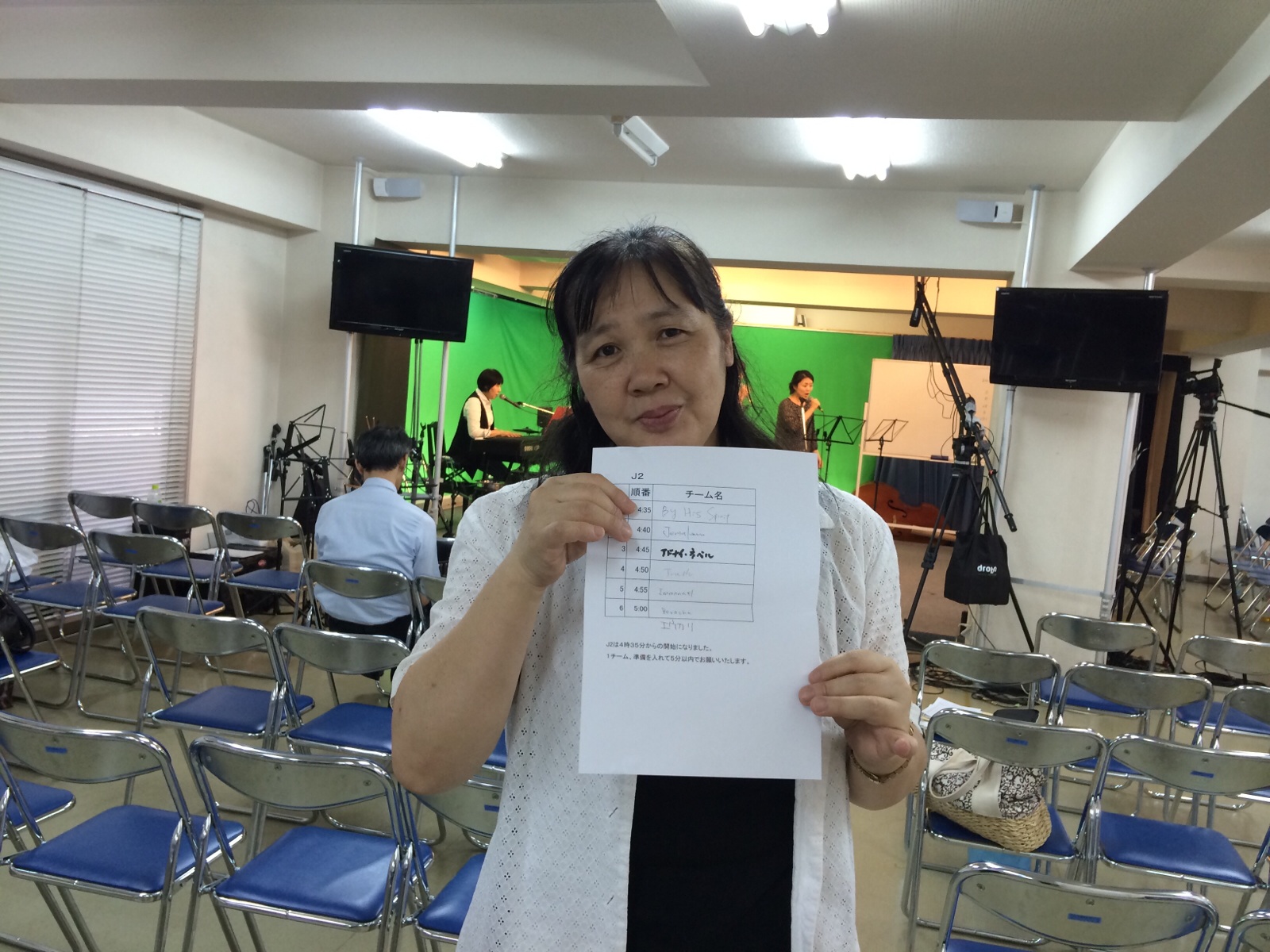 会堂ではJ2という賛美の時間。 『夫婦でどたばた』のシオンさんと『Joy joy joy!!』のやまなかさん、エウカリで順番待ち。