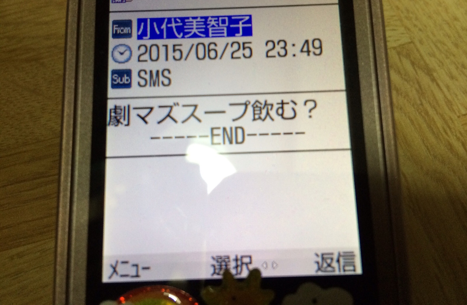 今度は、相方のおじろさんから、こんなメールが。げ、劇マズスープ???なんだかわからないけど、飲む、飲む〜。 『いただきま〜す 横尾』