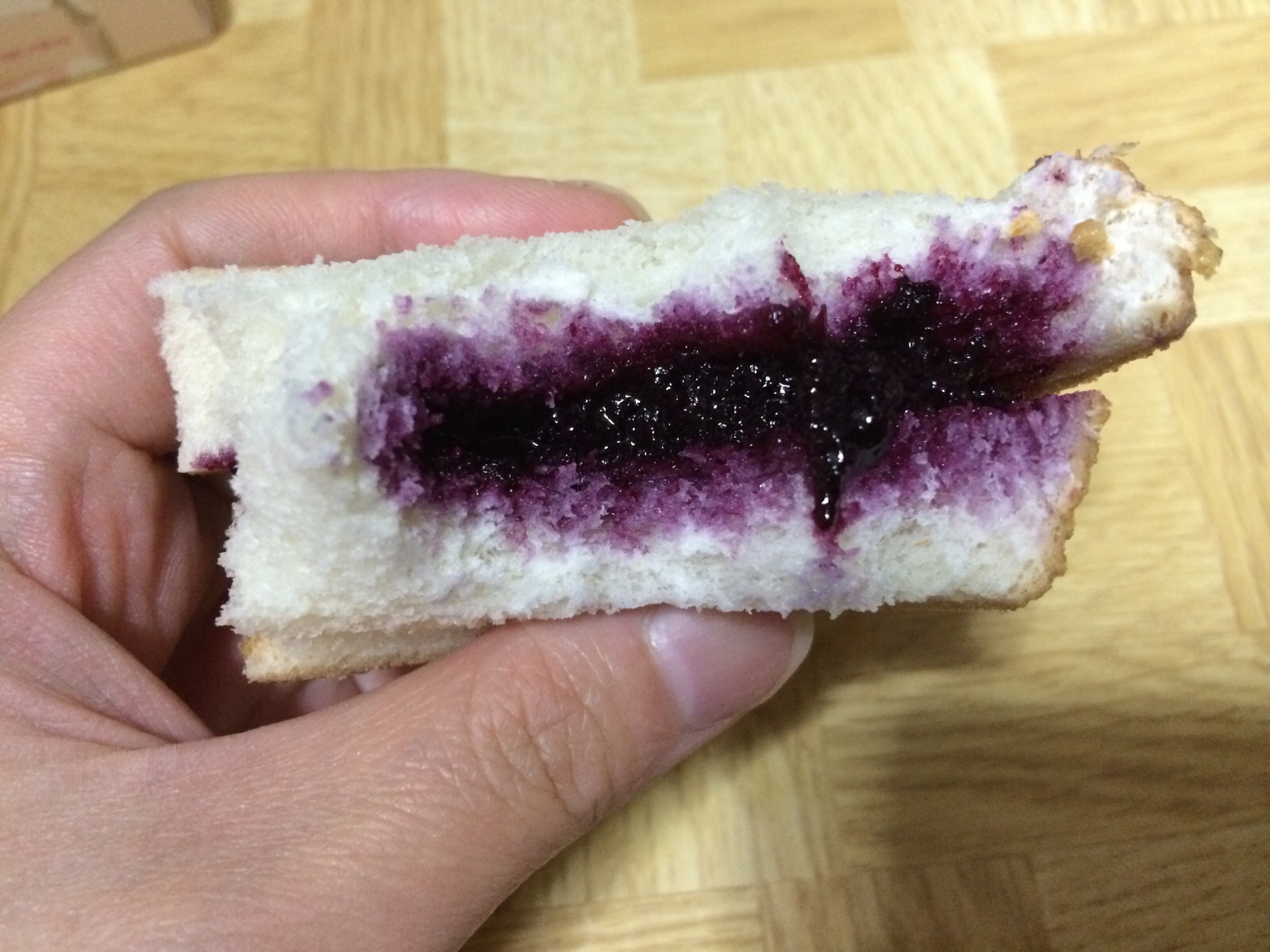 ブルーベリーのジャムを塗ったパン食べてます。 「いただきま〜す 横尾」