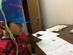 奇妙な帽子に見張られている感じがしますが、なぜかいつも以上に真剣に取り組む息子です。