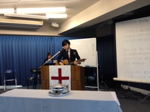 後半の賛美へ。 今日のメッセンジャーの真境名さんが賛美リーダーです。