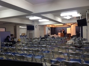 礼拝に向けてお祈り中のキブツの真境名さん。これから、はじまります。