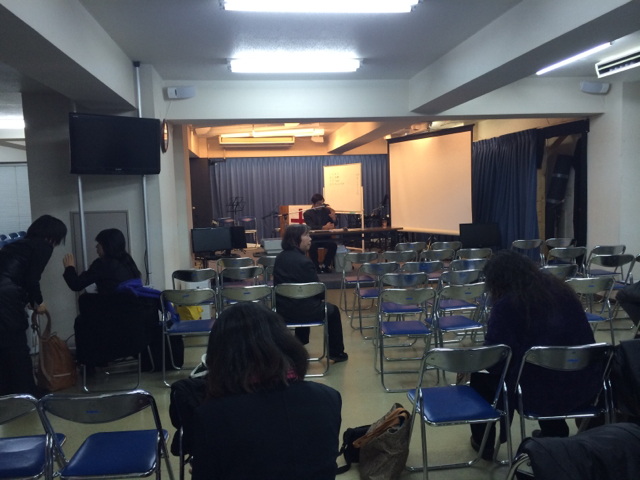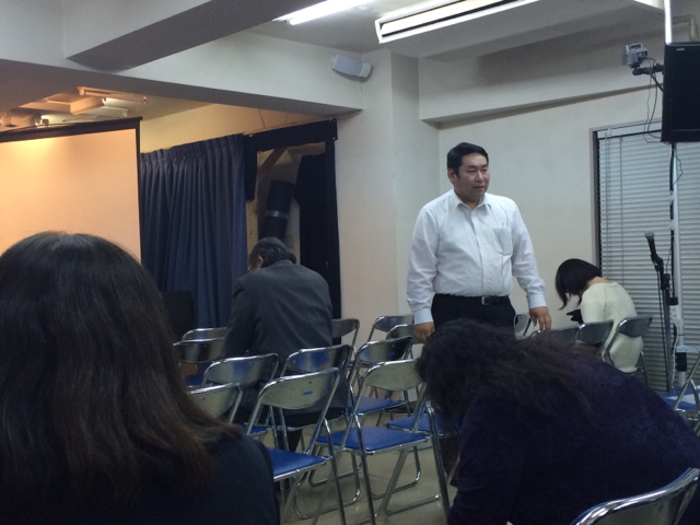 伝道師会中です。 キブツの真境名さんが話されています。