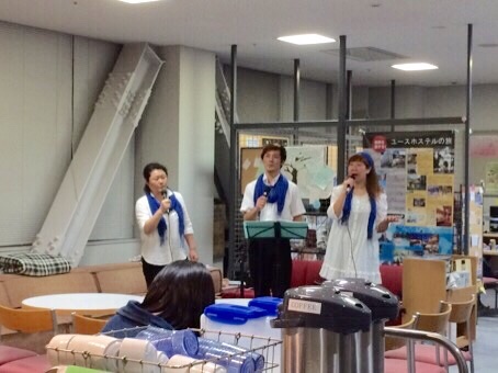 新大阪ユースホステルのロビーで約1時間のコンサートをしました。
