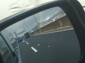 バックミラー越しですが虹出ています。