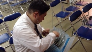 聖餐準備完了!賛美リーダーの漆間さんも賛美の準備にとりかかります。