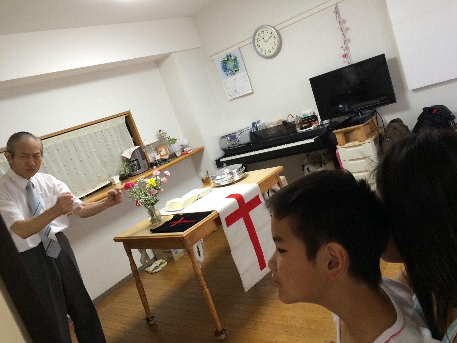 火曜礼拝にお孫ちゃん2人も参加してました。(メッセージの最後..)メッセンジャー熱くなる٩(• • )۶ 大和校 na