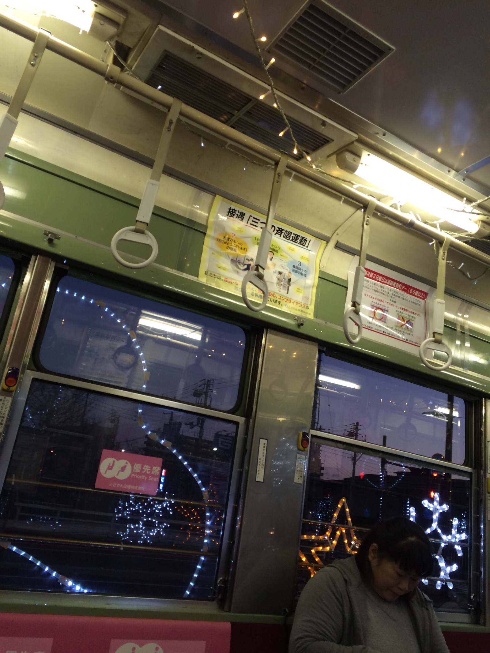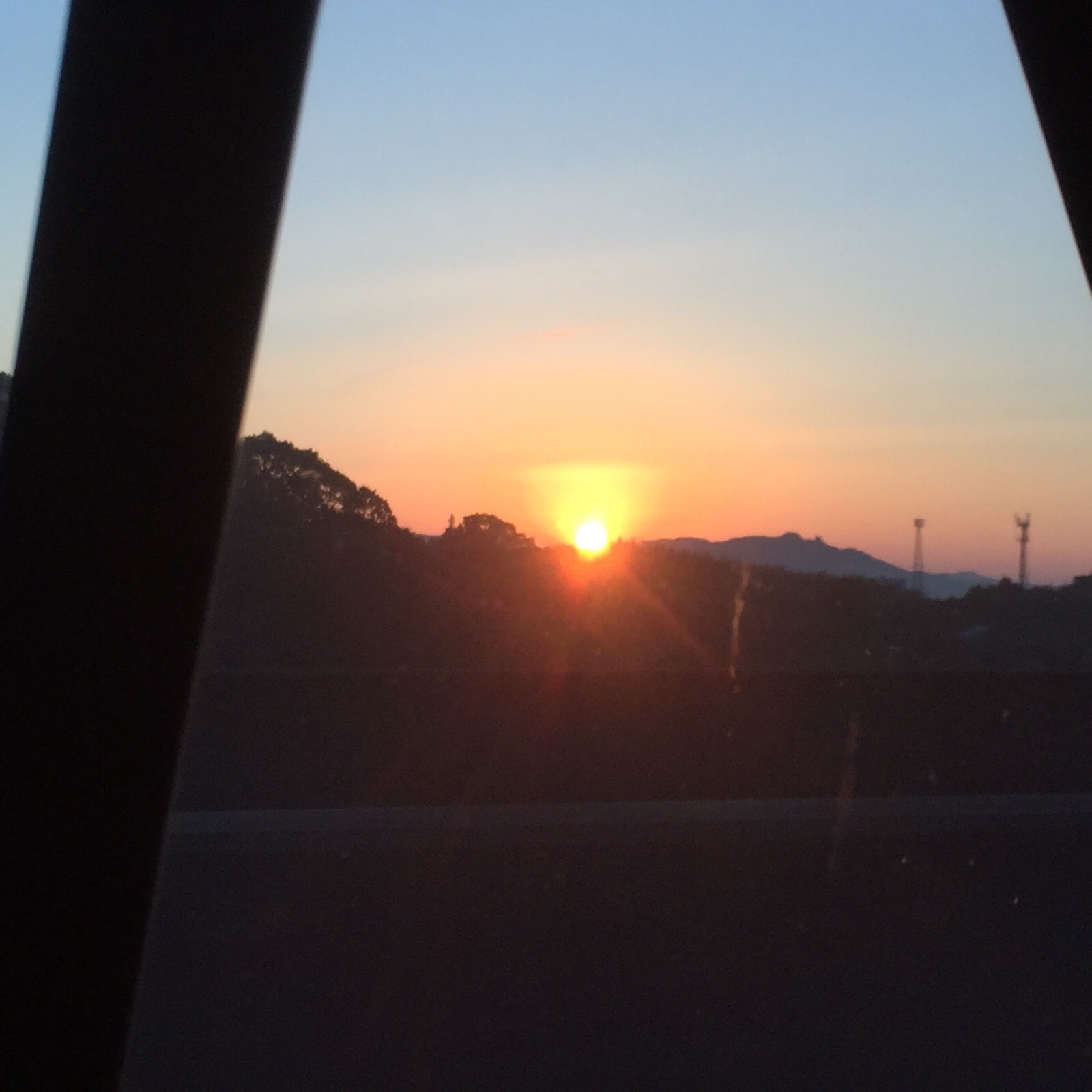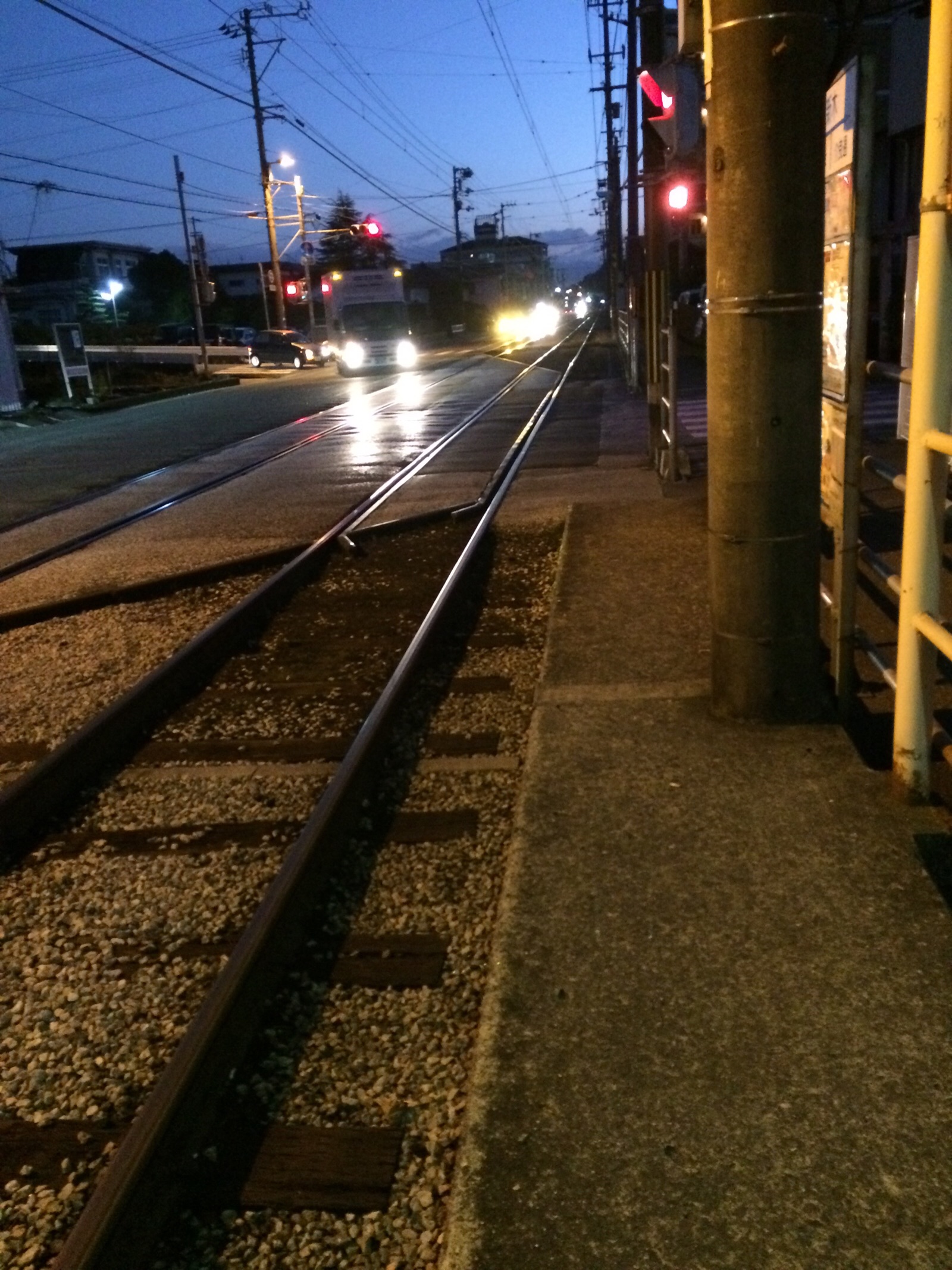 高松へ。始発の路面電車にのります。東の空が明るくなって来ました。