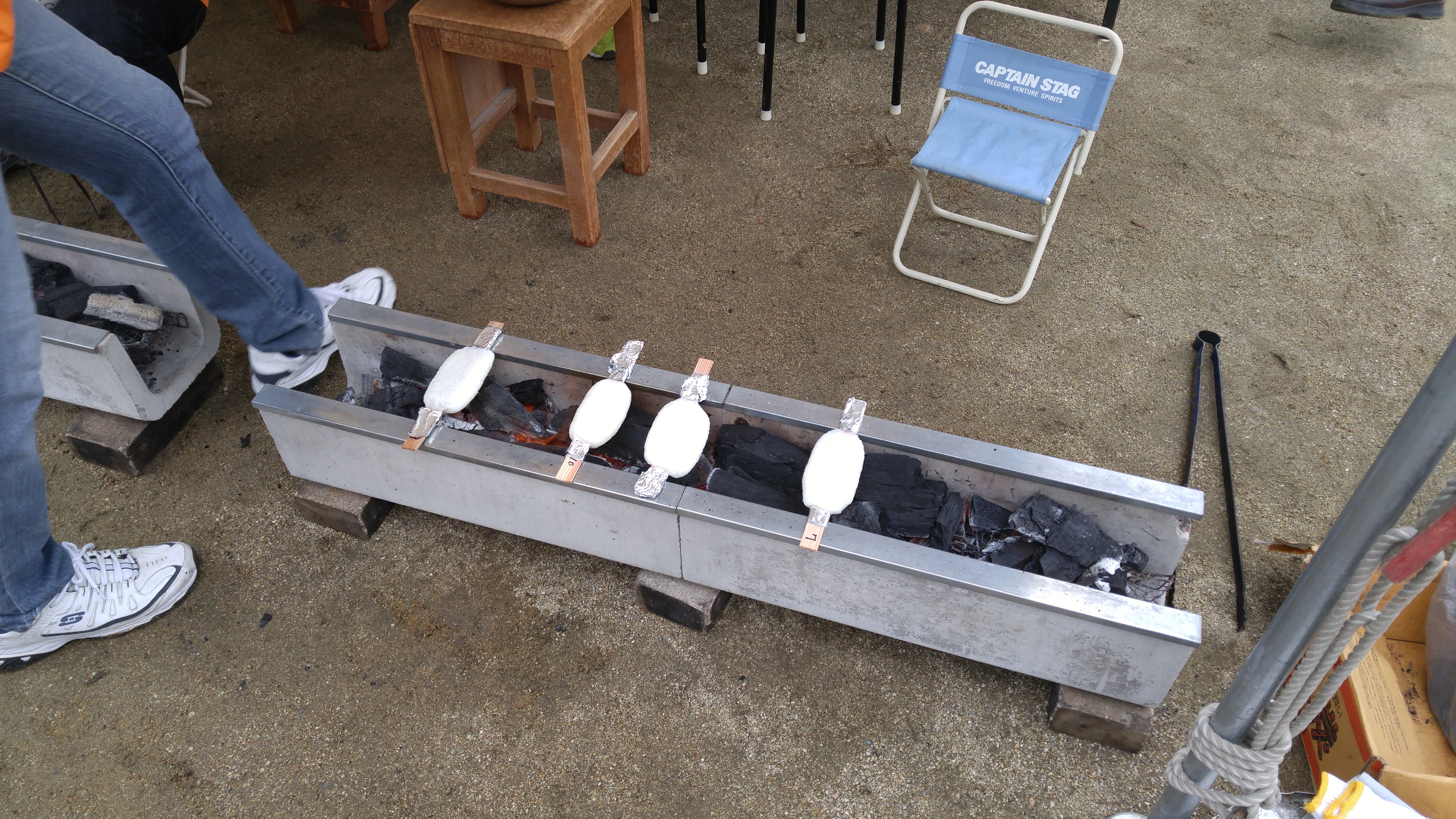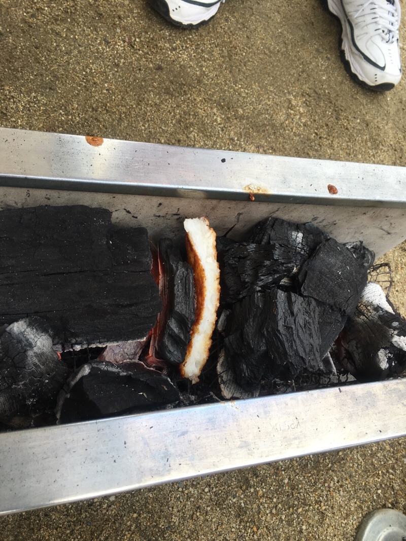 五平もちの半分が割れて炭の中に落ちてしまいました!感謝して食べます。