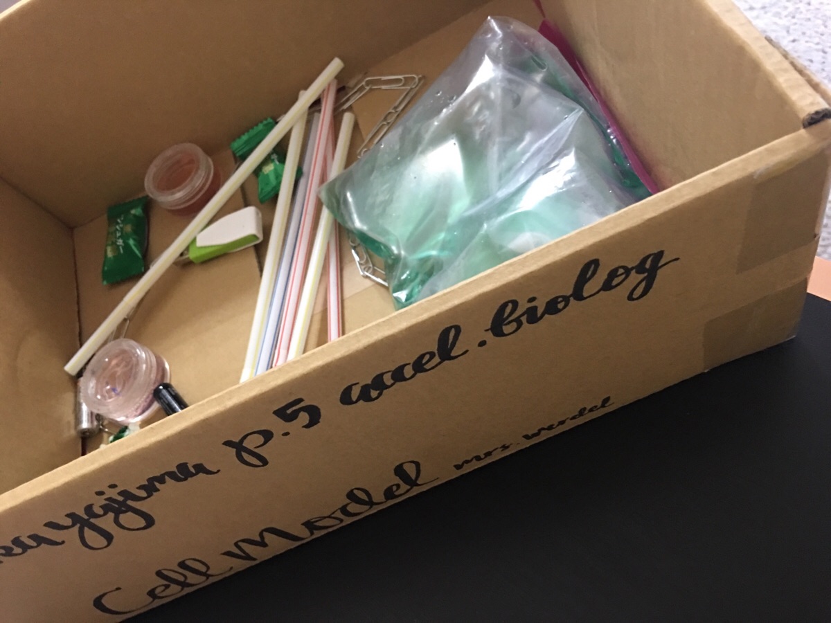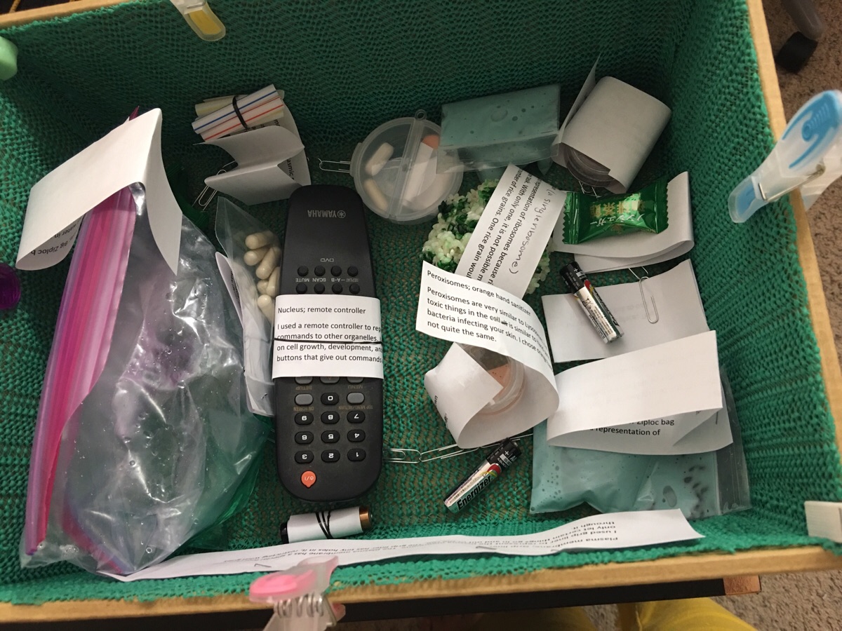 娘が宿題で四苦八苦してました。体の細胞の構造を、似た働きと似たカタチのモノ、しかも家の中のモノを使用して表現する宿題です。やっと完成間近。
