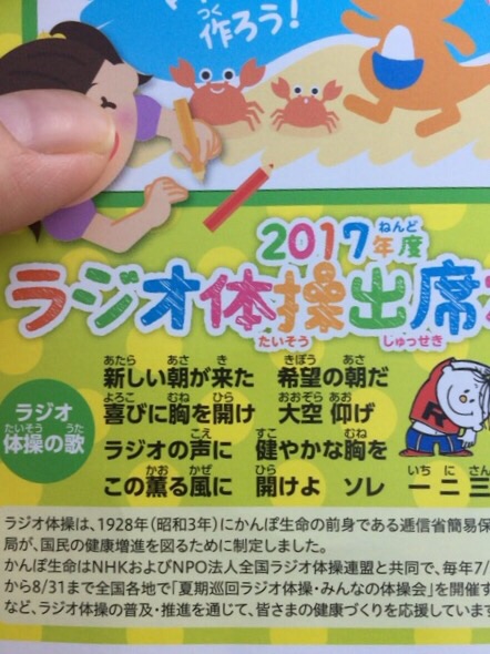 当番でラジオ体操ならぬ、わくわく体操。 カードにラジオ体操の歌詞が。。