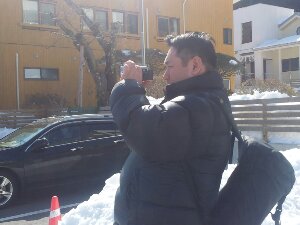 ビデオ撮影中の真境名総主事です。
