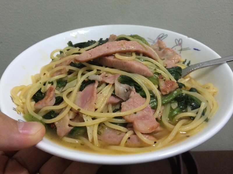これから、仕事のため1人で夕食です。 今晩は、ベーコンとほうれん草よペペロンチーノ。 自分で作っておいてなんですが、 なかなかいけます☆ モーセ出西光
