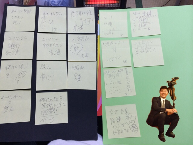 これは、映像合成を考えるためのグッズ。 各項目を並び替えたりしながら、ベストを探ります。 アナログですが、そこがまたいい感じです! 画用紙の色もイメージでチョイス♫ モーセ出西光