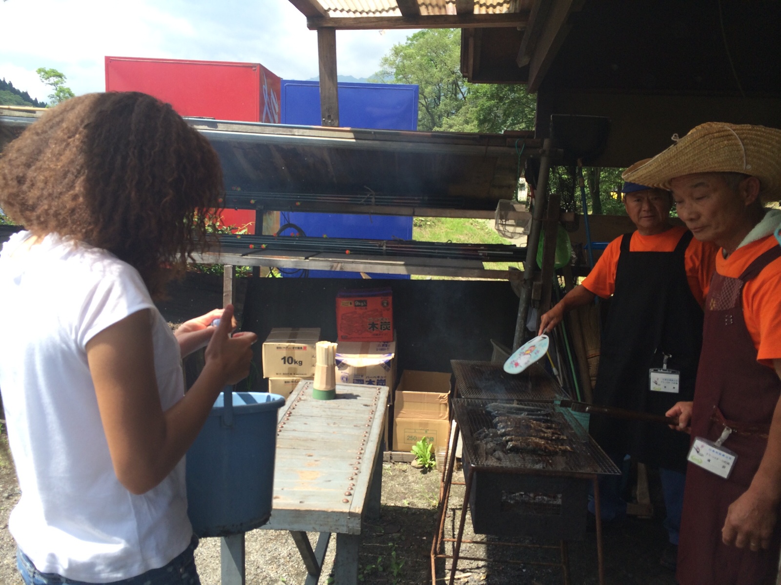 屋根の下で、釣りたて焼きたてのお魚食べてます! 美味しい♪ レク、グリーンスポーツの森