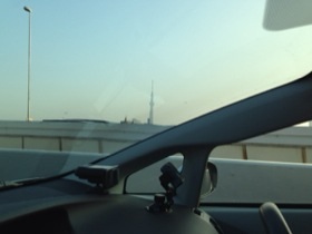 渋滞の荒川沿い。スカイツリーを川向こうに見ながら南下中。船橋迄、あと少し。