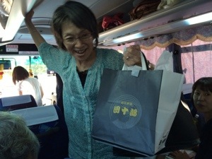 関西バス号。 京都桂川で降りる妙子さん。お土産のわさび漬けを忘れてました。 すぐに気がついて良かったね。 兵庫のN