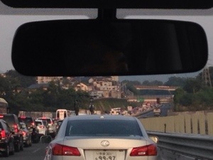 今度は調布辺りで、この先8キロ渋滞の表示が。その為今高速から降りる所です。 柏