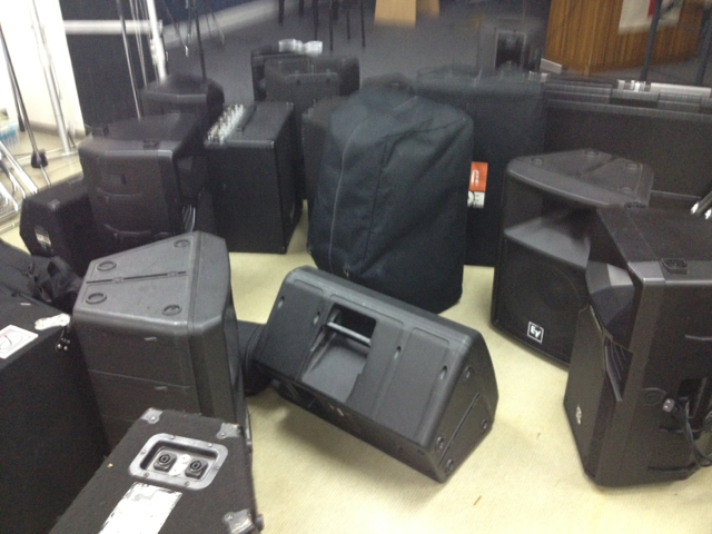 重い機材を男性だけでなく女性も運びこみました。設営部隊の皆さん、あとはよろしくお願いします。