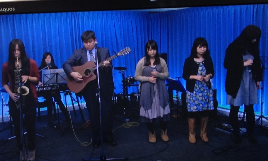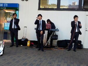 こちら阿佐ヶ谷駅前では、Giftsの皆さんが路上ライブ中です。通りすがりの方々が足を止めて「上手ね!」と聞いておられます。