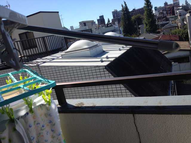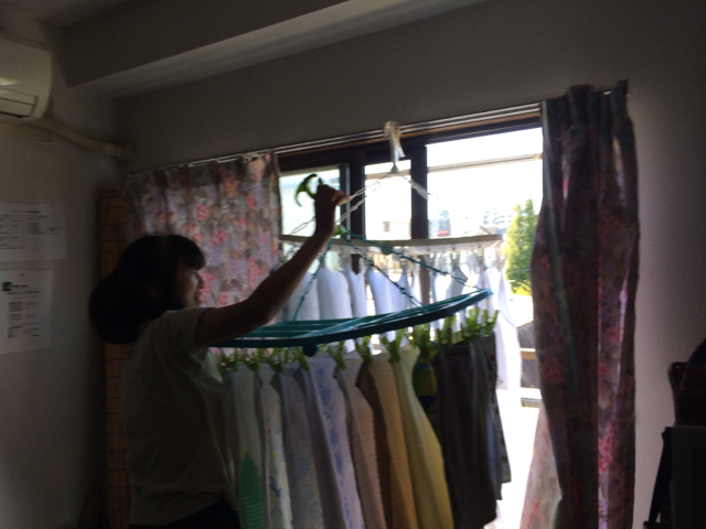 だんだん風が強まっています。 先ほどから洗濯物が煽られて、このように物干し竿がかけてある所からガタッと外れてしまうほどです。
