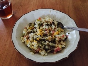 台風が九州に上陸しています。停電で、冷蔵庫の中のものを早く使いたいので、高菜チャーハンを作りました。遅い朝食です。 熊本 YA