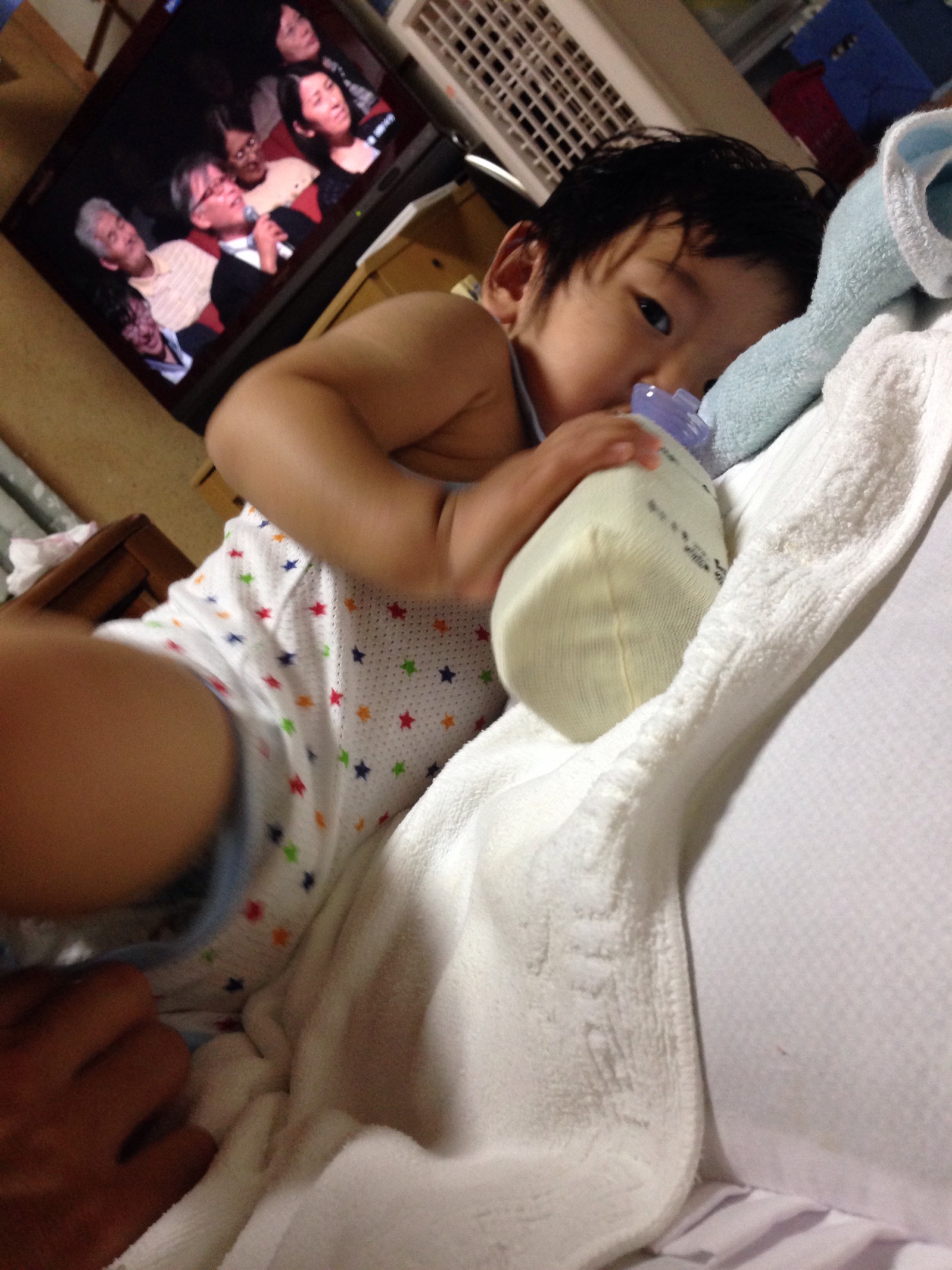 ちょうどお風呂あがりで、白馬のゴスペル大会のDVD見ながらバスタオルで拭いてもらってました☆