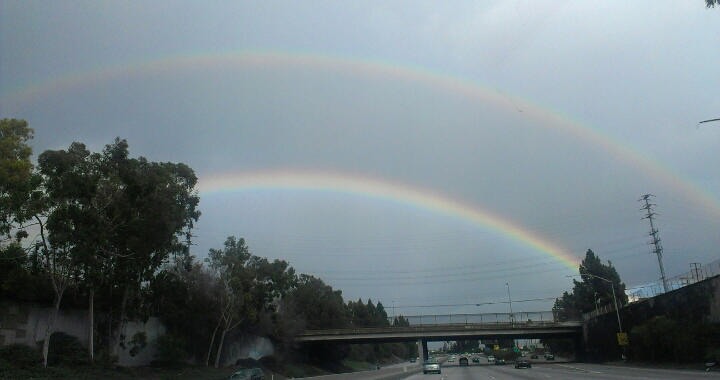 チームが飛行機で移動中に、ロサンゼルスに出た二重の虹。