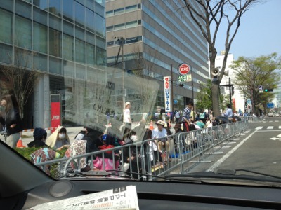 仙台の街は羽生選手を見る為にたくさんの人々が座り込み長い列が続いています。
