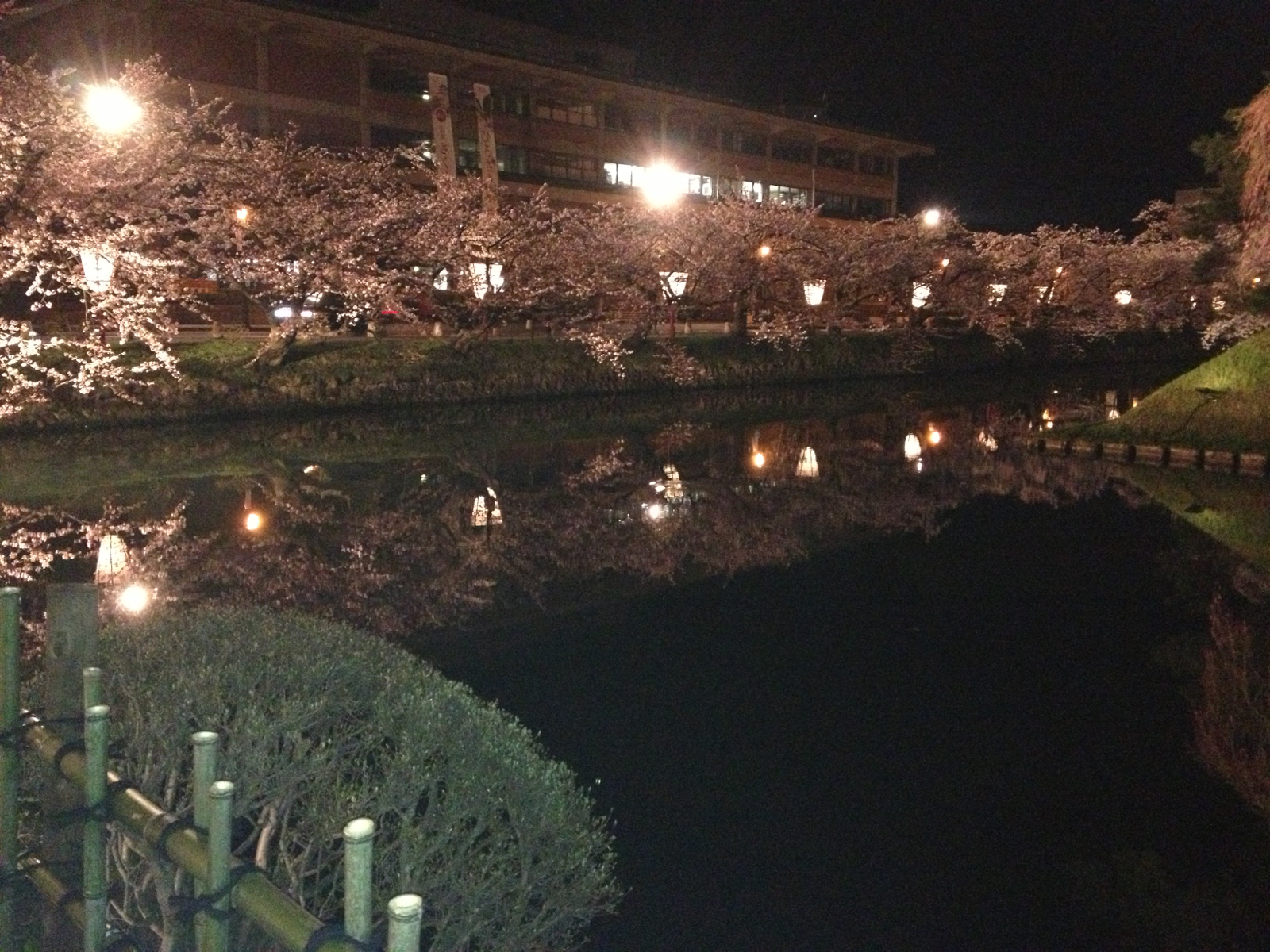 水面に映る桜が美しかったです。 聖なる神の都エルサレム教会(弘前)