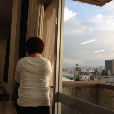 夕暮れ時ですが、日差しが眩しくなり、カーテンが引いてます。