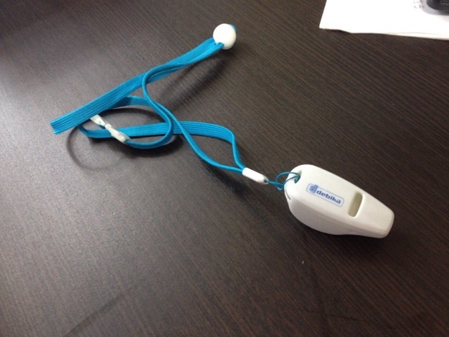 LEDホイッスル。東日本大震災の後に買い、欠かさず持ち歩いてます。電池を入れると光ります。