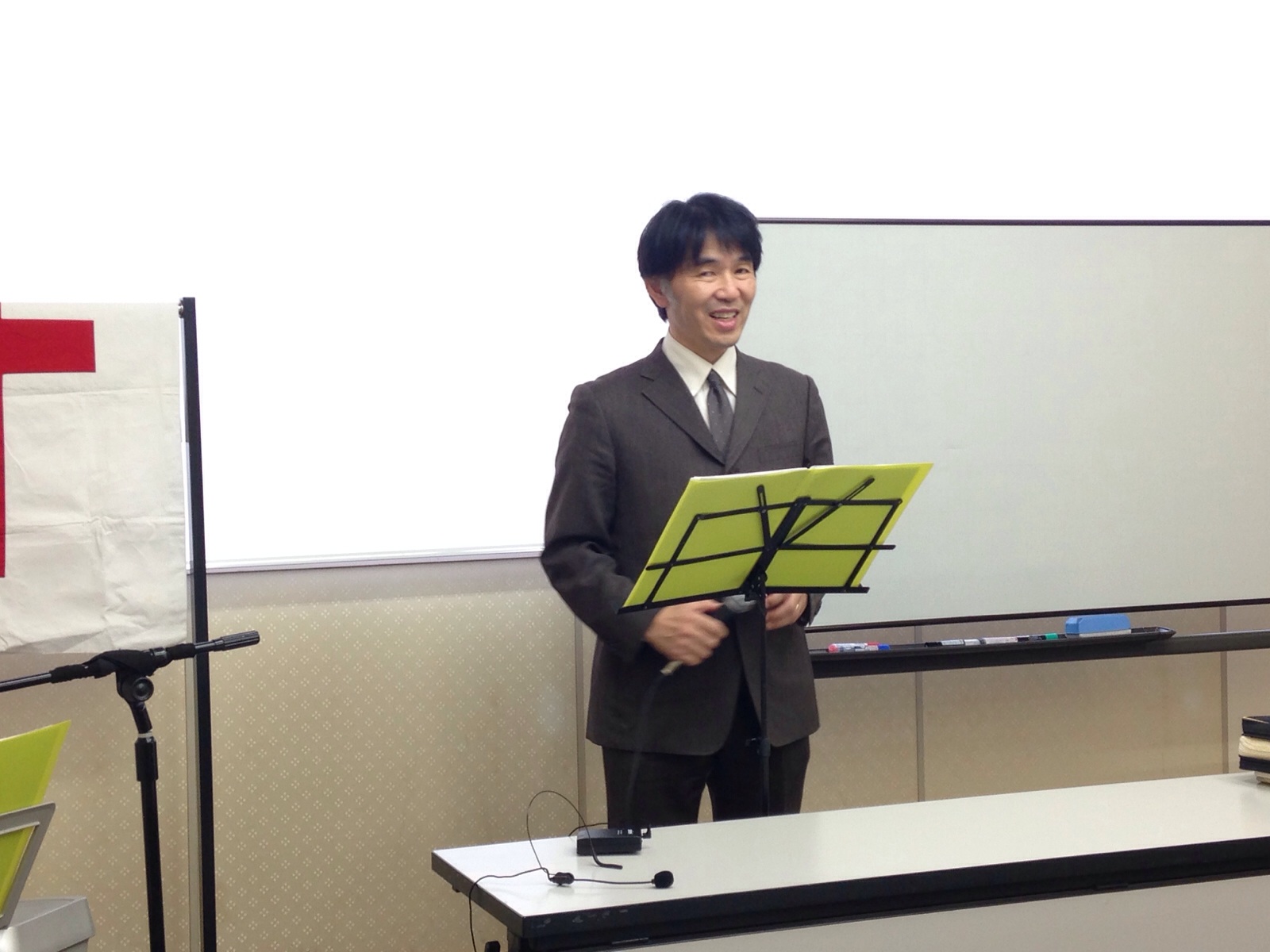 秋元さんは、ヘッドマイクでセミナー中。