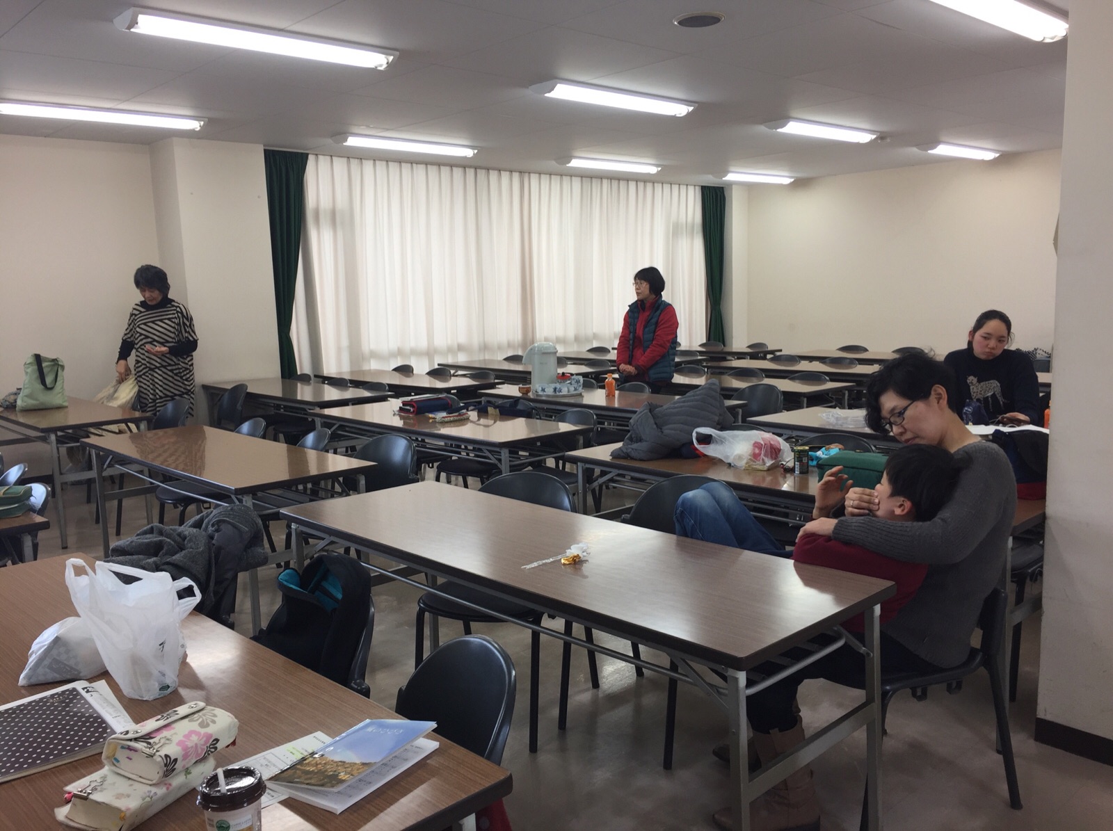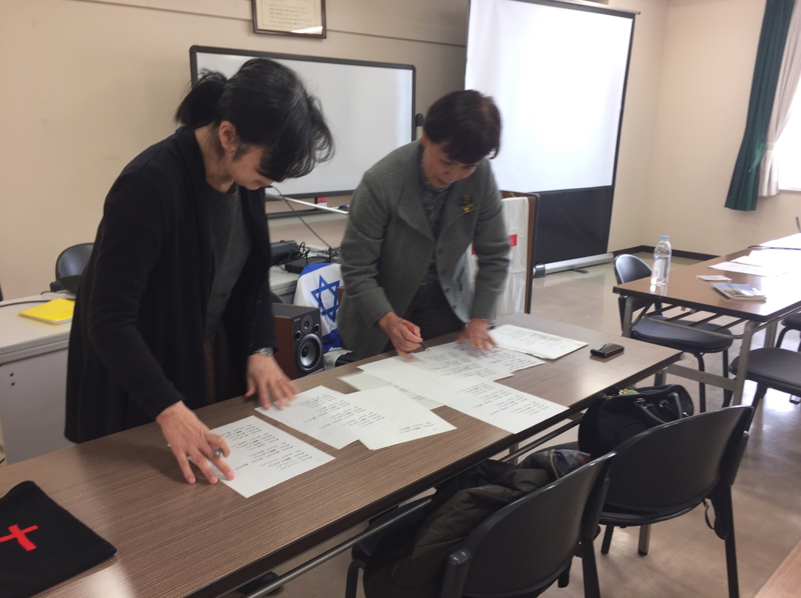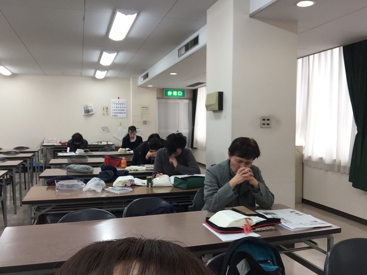 各クラスにわかれて学びをしています。明日お会いするパウロ秋元さんの音声をイヤホンで聞いています。