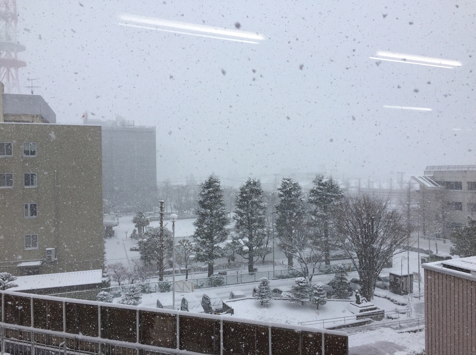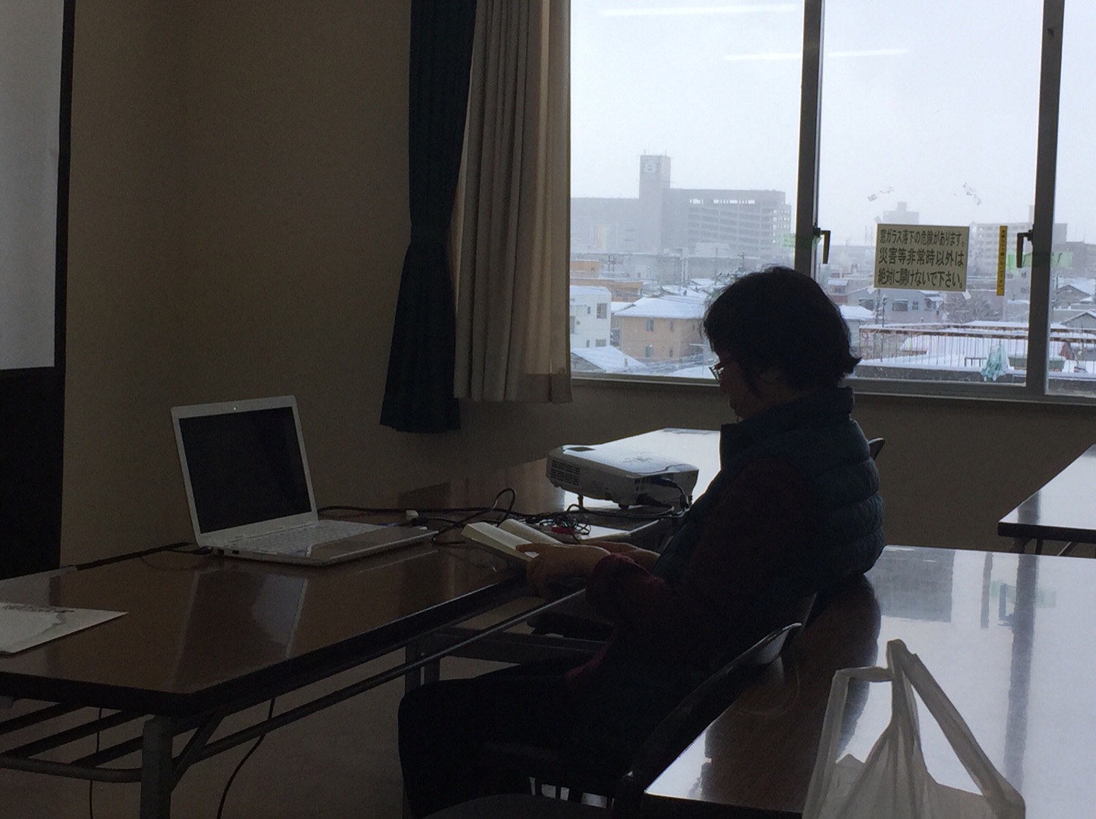 礼拝会場から外の風景を撮ってみたら、雪がくっきり映りました。「外は雪♩神様がともにいる♩」