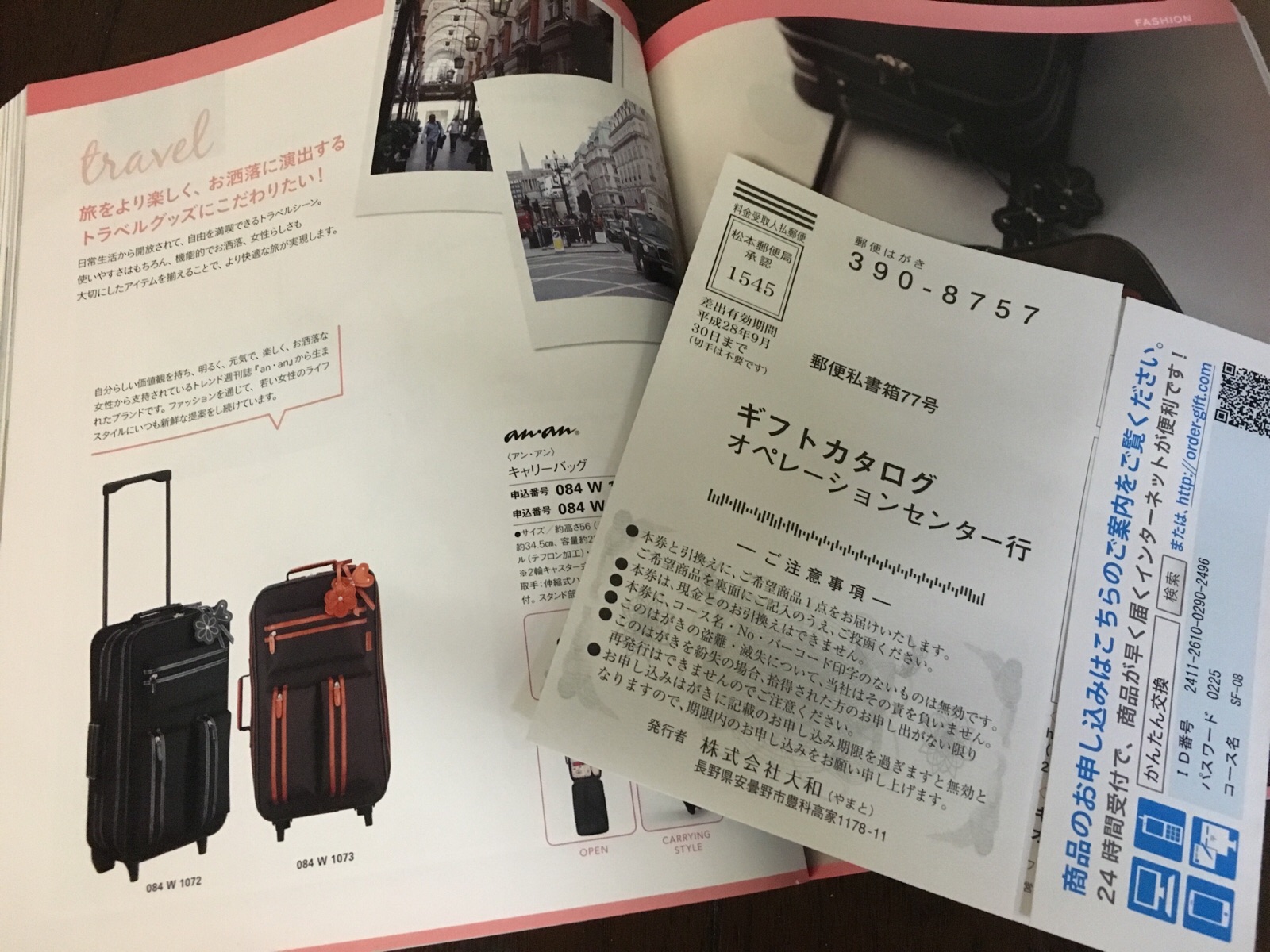 ずっーと、頼むの忘れていたギフトカタログ。今日、思い出しました〜!信仰の歩みでキャリーバックを!海外宣教にどんどん出て行きまーす。