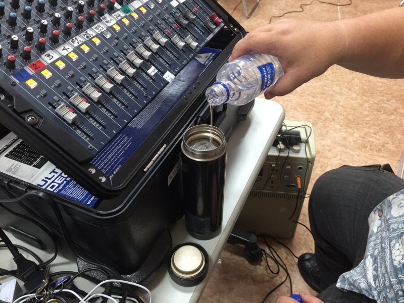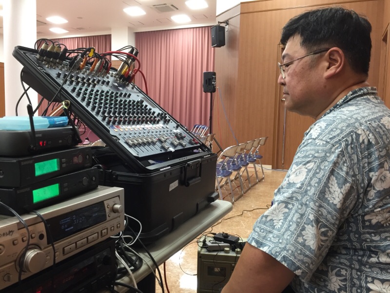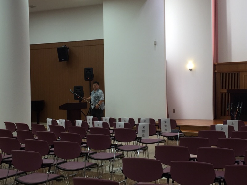 10:30から荷物を運び、11:00からセッティングしています。初めての海外の賛美グループのサウンドチェックが控えています。暑いっ!と言ってる永藤さん! 沖縄エルサレム D