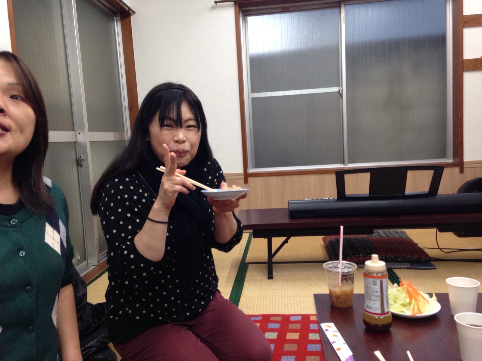 賛美練習が始まります。到着したばかりのジョイさん、慌ててます。