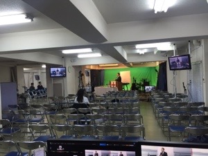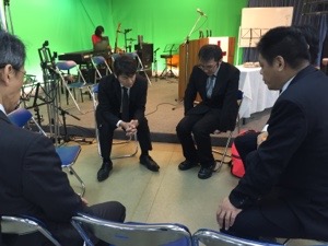 設営のみなさん、お祈り中! 第一礼拝にむけて備えます。