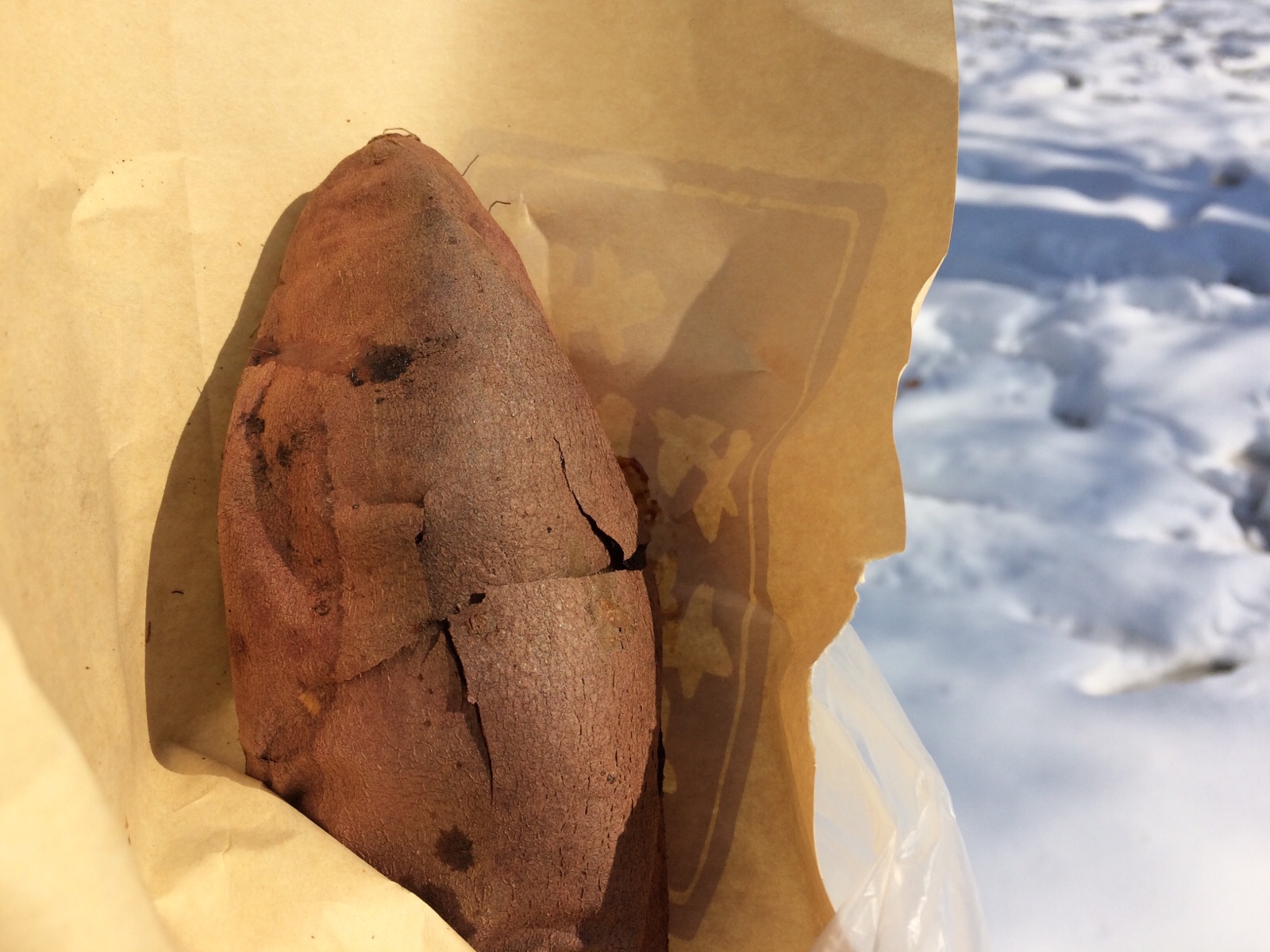 焼き芋〜。今日、帰りはどうしましょう、と神さまに祈ってます。